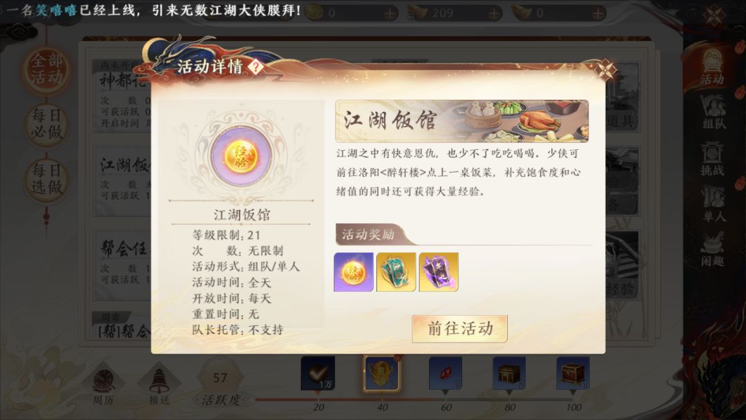 1、在等级满足21级后可参与江湖饭馆活动。