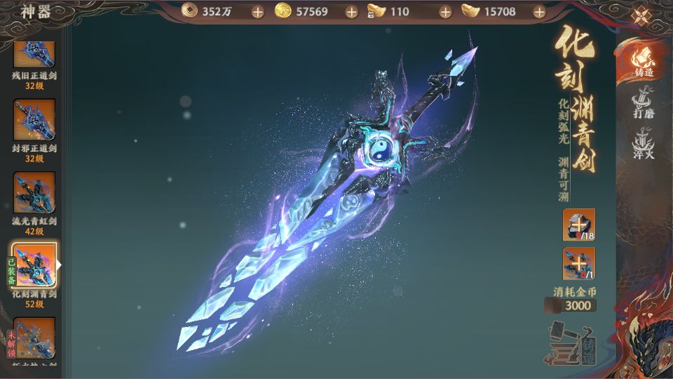 4、在满足等级后,铸造神器需要黑墨寒铁以及上一个等级的神器作为材料,消耗一定量金币可铸造新神器。