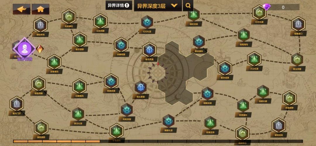 地图中心灰色圆盘中,有着不同指向的菱形点,每层的菱形点数目不同,全部点亮这些菱形点后击败异化克丽丝,即可进入异界下一深度探索。