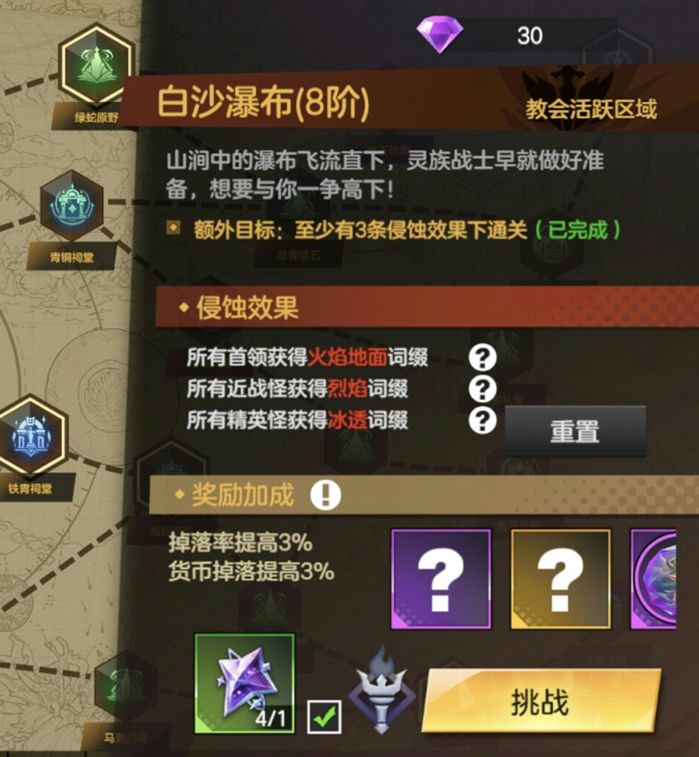 击败他们便点亮1颗地图中心的菱形点,当然失败了会失去5点能量,需要重新积攒20点能量后才能再次挑战boss。如果担心挑战会失败,也可以先练习再挑战。
