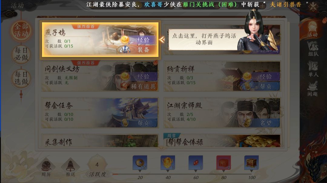 1、活动介绍燕子坞活动每天第1次完成会获得奖励,可以自动战斗,协助他人进行燕子坞可以获得侠义值。