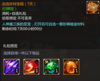 伤害达到3.6亿时可以获得3个自选珍材宝箱,里面的各类材料都是非常珍贵的哦~