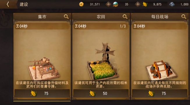 一对一骑马单挑对武将的战力要求较高,因此我们需要通过城建经营玩法来提升武将战力。城建经营玩法也是《三国诛将录》手游的主要玩法之一,我们可以自己经营城镇建设,甚至还能进行农田耕种、兵器库打造等玩法,游戏里的铁匠铺、兵器库等设施也有不同的作用,合理配置资源可以助力武将快速升级。前期我们可以通过城建经营玩法不断提升武将战力值,后期就可以在战场上尽情厮杀了。