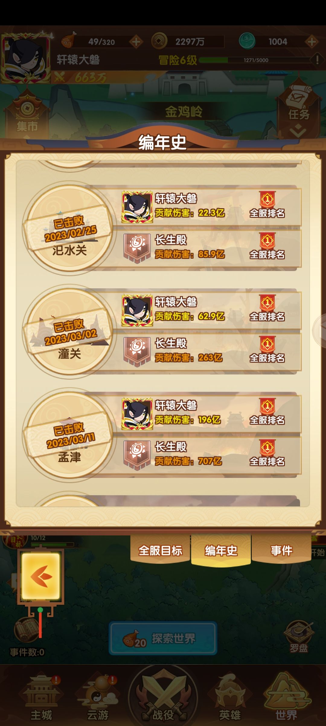 其次就是姜子牙吉吉的水系双c(要开局水系来的多,不然还是建议走木系)本人玩的就是这套,因为没有抽到太乙,几张姜子牙开的局。推荐主输出吉吉公主,副c姜子牙,主t妲己,搭配辅助兔子,最后一个位置可以灵活上人,最好是上个水系控制(多水系对吉吉公主加成较高且姜子牙对被控制目标造成额外输出)水队的优点是不容易被卡关,因为控制多可以多试几次,运气好能过,且因为双c都是群体输出,对关隘造成的破坏力是巨大的,可以刷关隘排行,这点是木队比不了的,个人关隘输出图给各位参考
