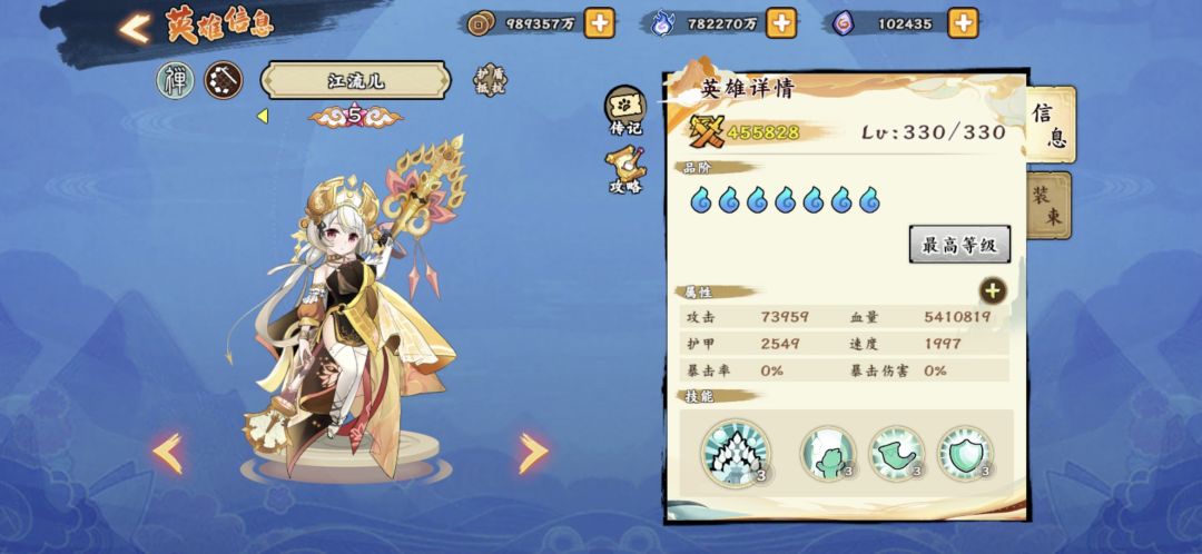 江流儿是一名辅助与治疗兼顾的治疗英雄,她的战技能够治疗全队成员并提供护盾,被誉为第一奶妈,回复量惊人,有盾有回复并为队友提高造成的伤害。不仅如此,她还能为敌人施加【易伤】增加敌人受到的伤害。她存在在战场上时,能够使全队成员拥有增伤BUFF,受到减益-属性减益时,有一定概率抵抗此效果的影响。