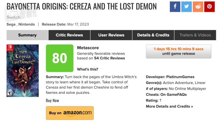 5.《蓓优妮塔 起源:瑟雷莎与迷失的恶魔》媒体评分解禁,metacritic收录了54家媒体评分,均分80。