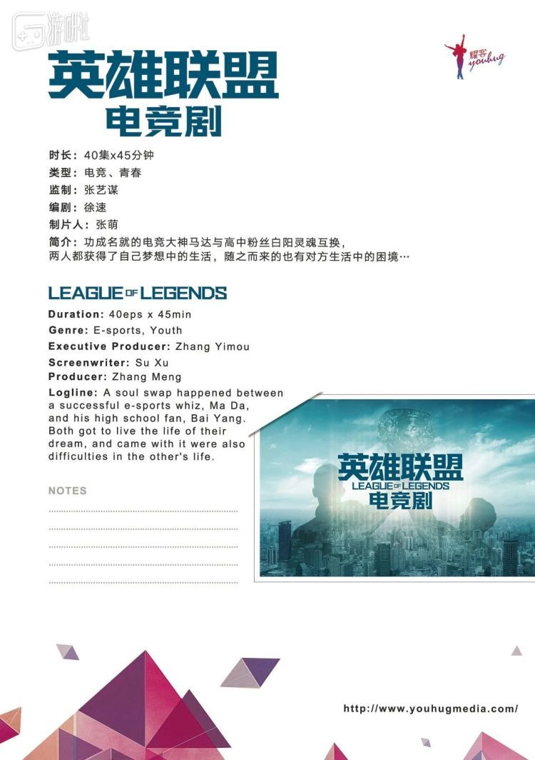 1. 耀客文化公布待播新片,其中包括金庸系列的《华山论剑》《东邪西毒》《南帝北丐》《九阴真经》《铁血丹心》,此外还有《英雄联盟》电竞剧。该剧由张艺谋监制,讲述电竞大神与高中生粉丝灵魂互换的故事,共计40集。