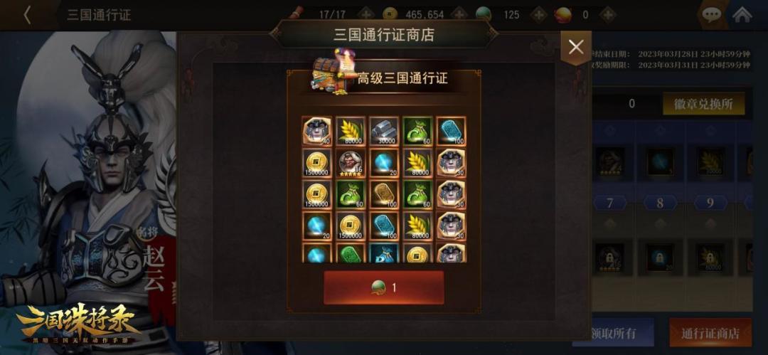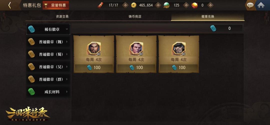 此外,在使用1宝玉即可开启的“三国通行证”中,完成任务,到达对应等级还可以获得数量可观的”徽章“,徽章可以在徽章兑换所,换取2星至4星的各种武将,满足主公们多样的武将培养需求。