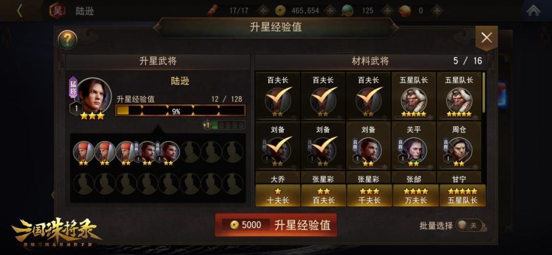 而星级则是点击正中间“升星经验值”按键,即可快速进入。消耗材料武将,即可快速提高升星经验值。材料武将可在各种战斗的奖励中获得,使用于材料的武将会消失。那在达到对应星级上限后,即可使用同名武将进行升星。那在星级选择上,可以考虑培养的武将是否是前中后期都会用到的角色(也就是资源浓缩原则)除了强力武将(或者xp角色)以及部分超越角色,可以拉满,或者是保留,剩下的武将则可以考虑卖出置换资源。