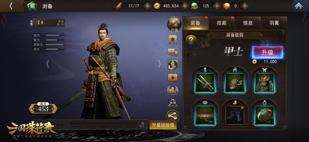 以刘备为例,对刘备身上的6个装备全部进行强化后,可以升级。升级后的将领防御会增加,每次达到C级、B级时都可得到新技能。例如刘备的旧双剑,需要强化材料砂铁,获得方式有多种,如玩家可在商店使用宝玉购买、通过材料选择券获得、材料交易以及桃园结义、黄天等玩法战斗获取,当然也可选择花费金币自动强化。进行强化后的旧双剑,从原先武力5,智力4变为武力7,智力6,暴击概率为2.4%,同时名字也有所改变,为阴阳双剑。