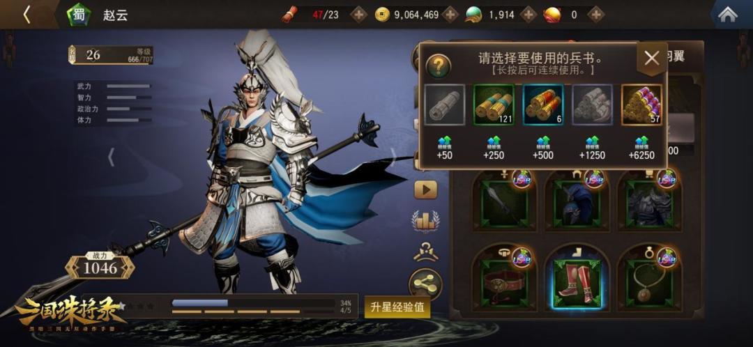 武将等级的提升通过点击右上角“升级”按键,然后选取“兵书”喂养,即可快速升级,左上角等级为当前武将等级和所需经验条。在武将升级后,属性也会随之获得提升,不同的兵书获得经验值不一。兵书分为初级兵书、中级兵书、高级兵书、最高级兵书、特级兵书,经验值分别为50、250、500、1250、6250。兵书主要依靠日常玩法-每日战场产出,也可消耗一定宝玉进行购买。