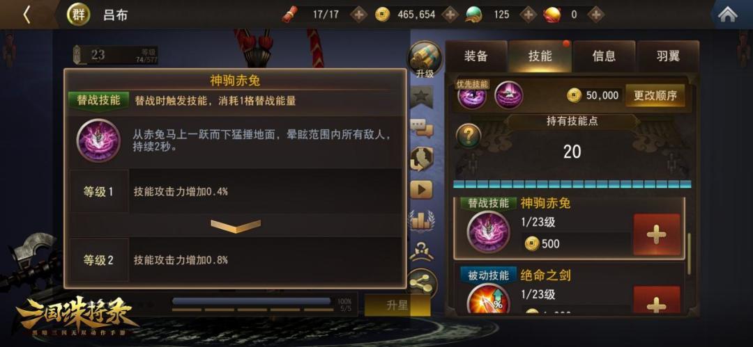 每个英雄初始有两个主动技能,以吕布为例分别是【武神咆哮】和【画戟破天】