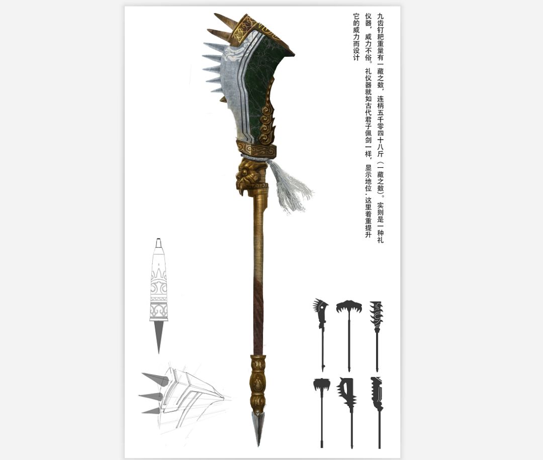 众所周知猪八戒用的是九齿钉耙,那天蓬元帅用的是什么武器呢?《洪荒西行录》的美术大大既参考了典籍又结合了大家对九齿钉耙的设定的理解设计出了天蓬元帅所持武器,威力巨大。
