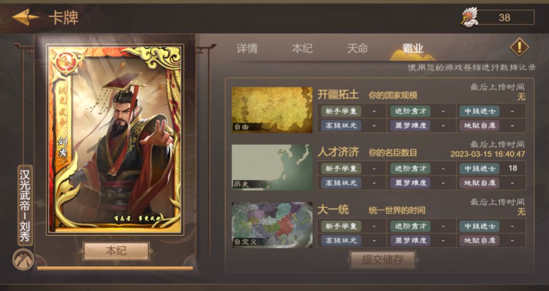 ◆「霸业」用来录入您的足迹,可以根据您指定的某一份存档,记录这位皇帝的最远历程