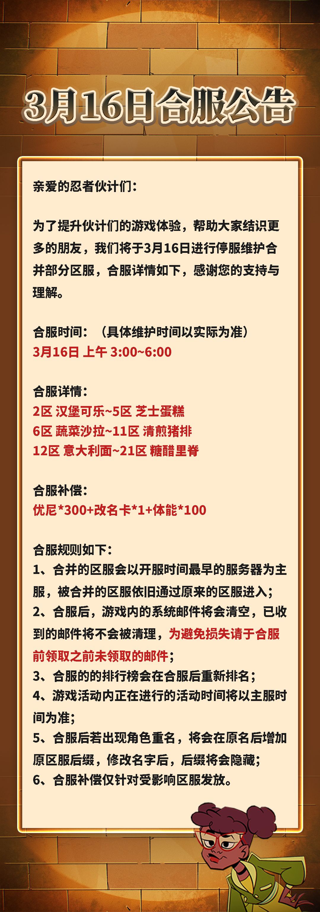 为了提升伙计们的游戏体验,帮助大家结识更多的朋友,我们将于3月16日进行停服维护合并部分区服。