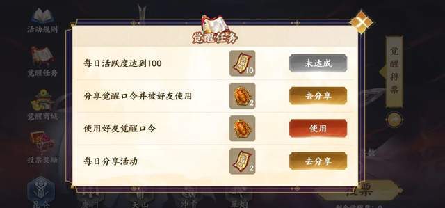 完成日常任务获取觉醒票为你喜欢的门派打call助力!更详细活动说明可点击这里查看!