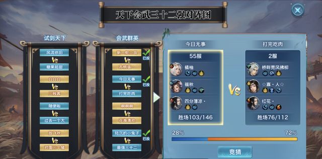 未晋级的少侠们,可以在天下会武比赛界面进行竞猜,竞猜成功可获得对应奖励一份~