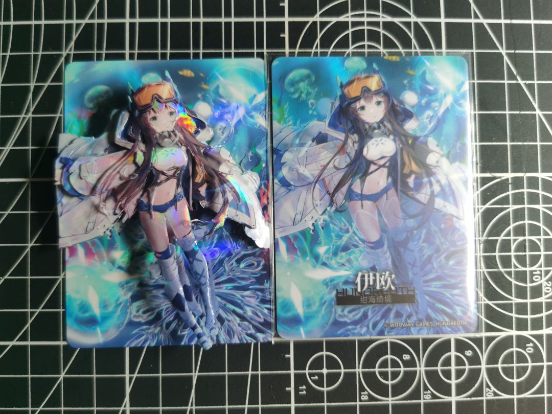刚开始想做这个的契机是,去年看直播知道官方会出浮雕卡,但只做签卡的图。本人比较喜欢伊欧,但不是很喜欢伊欧签卡的造型(不针对画师,只是不喜欢那个泳装造型/款式,更喜欢其他四星五星伊欧的衣服,五星伊欧也是泳装,就很喜欢她那个果冻状的外套)。碰巧当时还看了个游戏王卡雕的教程,于是有了自己做个卡雕的想法。