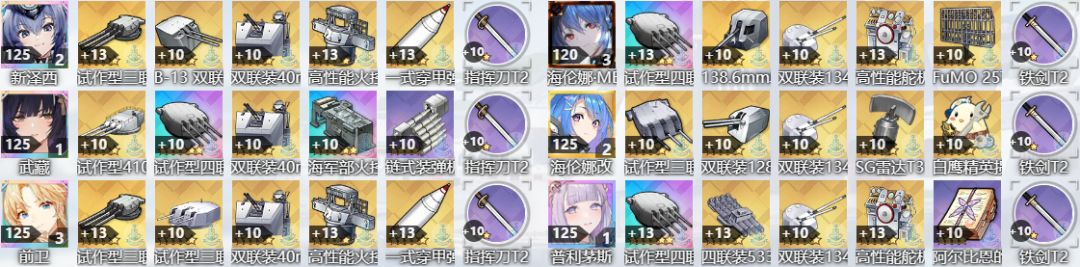 我一般是不用炮队的,因为没婚,装填不够,第四轮打不完,像视频中打的很极限。两刀是没什么问题的,这次生存压力也不大,装备正常带就行,不过要保证黑海妈有足够的输出去清掉骑士,黑海妈可以和海妈换一下副炮,凯旋炮是打重甲的,骑士是重巡,应该是中甲,另外这次对面机动比较高,后排可以堆命中,你贪炮击也行,那就带134防空炮和轻弩兵装。