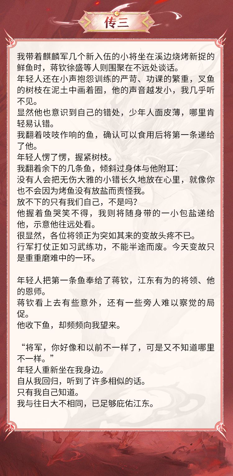 回归人世的煊明孙策邀请火麒麟一同出山,在与弟弟孙权敞开心扉之后,煊明孙策表示这一世的他无心争夺权力,认为自己更适合做一位冲锋陷阵的将帅,在孙权的全力支持下,这支全部由江东精锐组建的“麒麟军”成为了吴国最强大与特殊的部队,依靠着火麒麟日行千里的长距离奔袭能力,煊明孙策往往能承担突进奇袭的作用,也因此被各国士兵称为“麒麟飞将军”。