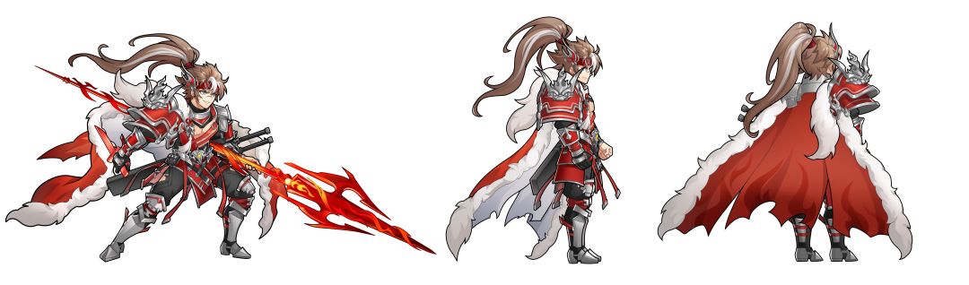 孙策的性格特点是开朗热情,富有幽默感的少年。同时这版造型有许多的武器配件,为了不让它们变成彻底的装饰,也突出人物的武艺超群,在战斗设计中首先考虑的就是对武器的利用。所以在怒攻和龙魂技能中都会同时使用2-3种武器攻击,其他技能中也尽可能设计出相应的攻击方式。同时用切换武器及多段打击的设计来突出角色敏捷、外放的性格设定。火麒麟作为这次设定中的重要元素也加入进了龙魂技中,并尽力给到一段演出来具象化麒麟与孙策的关系,让背景故事能代入到战场氛围中。