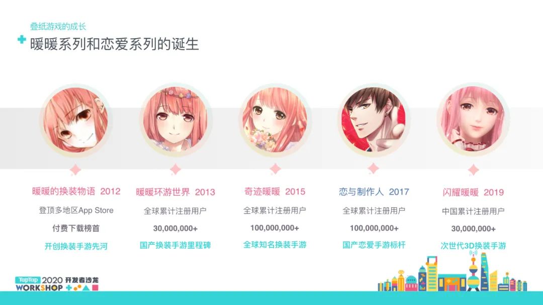 大家好,我是叠纸的姚润昊。今天我想讲一下叠纸是如何来做游戏的。首先简单介绍叠纸的成长历程:我们公司成立以来做了五个游戏,《暖暖的换装物语》《暖暖环游世界》《奇迹暖暖》《闪耀暖暖》《恋与制作人》;我们涉及了很多领域,像漫画、服装、密室、动画。