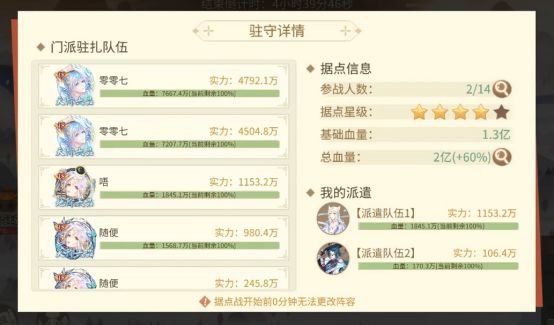 己方门派据点的总耐久血量,等于驻守己方据点的所有队伍的实力之和(另外还会算上银币捐献的加成)。