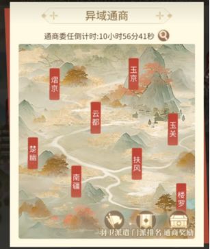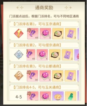 五、通商阶段(第4天22:00~第6天23:59)仅参加据点战的32个门派可以参加。根据门派在据点战中的排名,获得不同地区的通商资格。据点战门派排名越高,通商获得的奖励越丰厚。