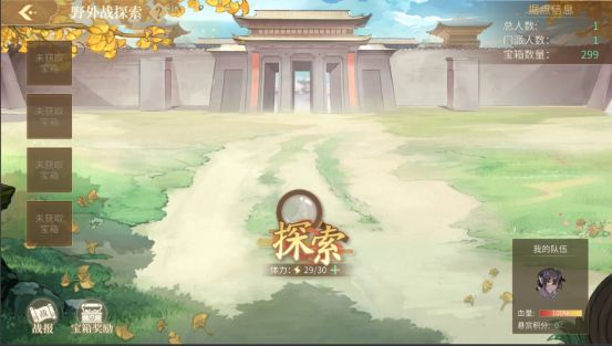 点击探索,消耗体力和银币解决各类事件,获得个人门派战积分和可用于捐献的物资(每个城市能够获得的物资不一样)