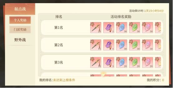 野外战结束后,门派总积分排名前32名的门派,将获得进入据点战的资格。