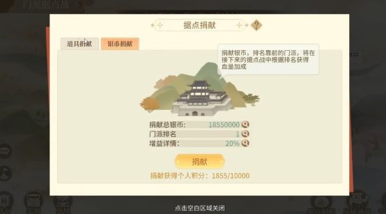 同时,捐献银币的排名,会对接下来的据点战的门派据点耐久度有增益效果。