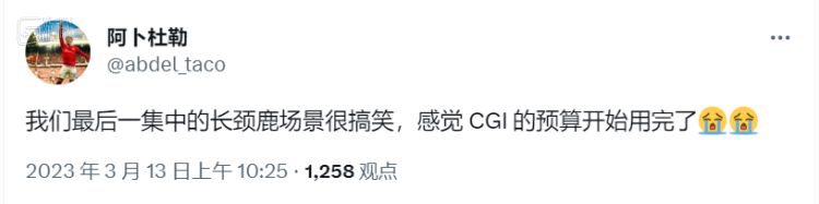 也正因为这个镜头是如此的重要,起初有些观众对“长颈鹿演员”的表现不是很满意。相比于游戏中的鲜活,剧中的长颈鹿反而显得很“无趣”。很多人猜测这个长颈鹿是三维动画生成的,和原作比起来,剧集里的长颈鹿有些“预算不足”的丑。