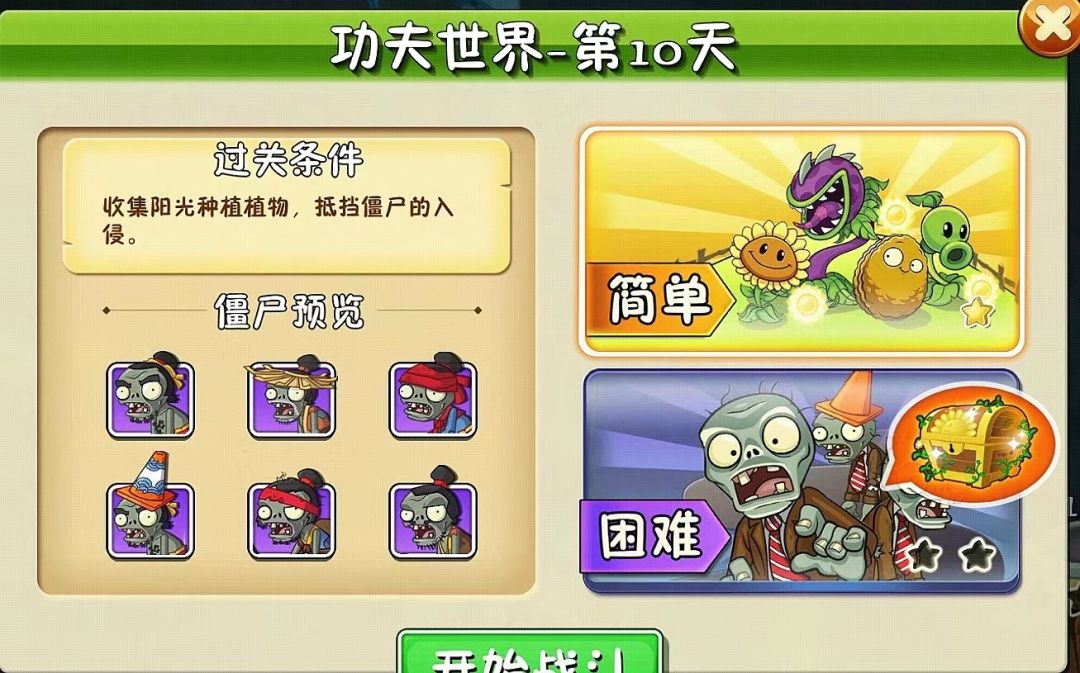 故事发生在功夫世界——一个富有中国武术特色,充斥着功夫世界僵尸的国度。首先我们先来了解本关的通关条件。通关条件:这个关卡是需要玩家收集阳光,种植植物,抵挡僵尸的入侵。这个关卡唯一的难点就是自爆僵尸,自爆僵尸在碰到植物后,可以引爆炸弹,对大范围植物可以造成致命伤害,玩家需要及时消灭这种僵尸,放上坚果墙搭配火葫芦销毁武器架也是很有必要的。
