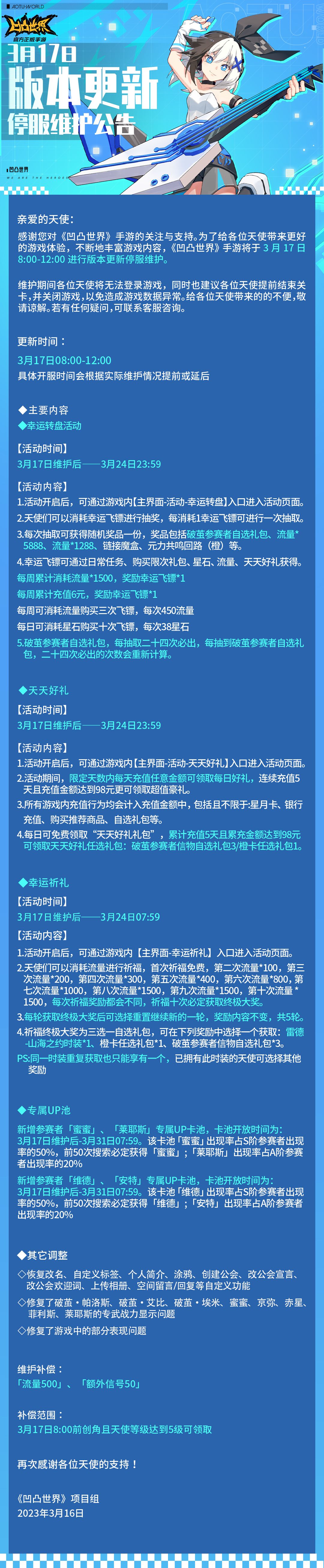 感谢您对《凹凸世界》手游的关注与支持。为了给各位天使带来更好的游戏体验,不断地丰富游戏内容,《凹凸世界》手游将于3月17日8:00-12:00进行版本更新停服维护。