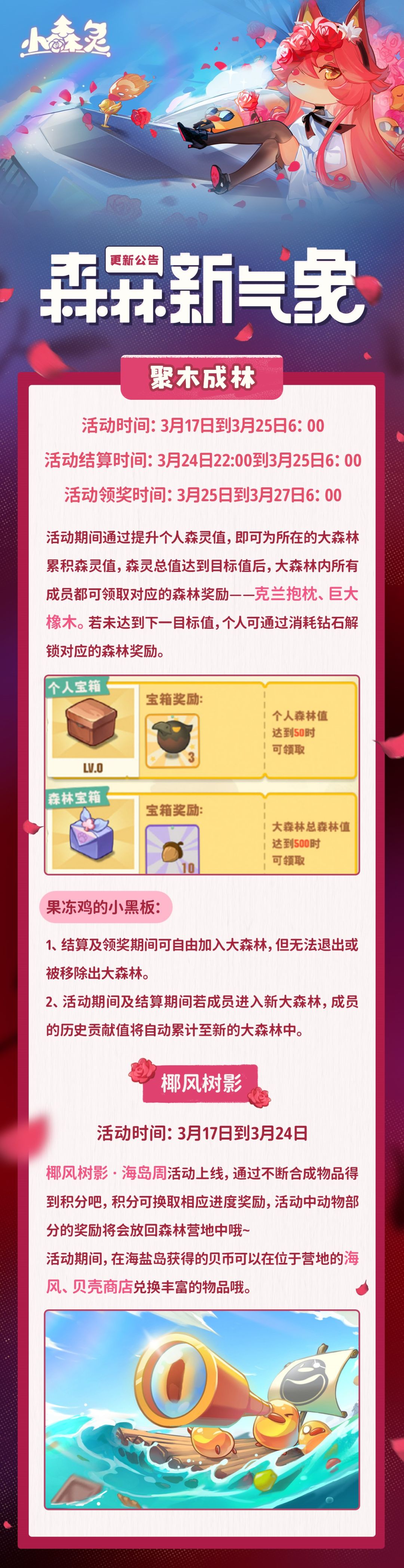 各位森灵王,小森灵会在明天(3月10日)7:00-8:00小小地打个盹哦(更新),可能根据实际情况提前醒来或赖床一会儿。更新期间将无法登录游戏,请合理安排游戏时间哦~更新结束后,将通过游戏内邮件发放补偿,届时请大家前往领取。