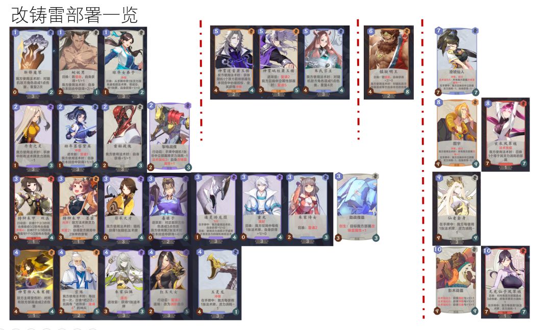 总体来说比较依赖澄琥仙人和图宇跳费,如果组改铸雷的话,除了10费的新卡不带或少带,其他新卡应该是都要带满的,共占不少于22张卡位,剩下的牌应该围绕buff,铺场,过牌构筑。