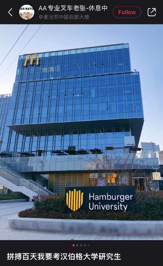 如果是有志于学术的发展的麦门信徒,则可以考虑报考位于上海的汉堡嗝大学,精进汉堡理论基础,为麦门添砖加瓦。顺带一提,这个“大学”实际上是麦当劳的中国总部,里面有八层,跟麦当劳巨无霸汉堡的层数一致。一层二层是对外营业的餐厅,最多可容纳200人同时就餐。