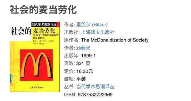 没有“烤”上汉堡嗝大学的信徒也不必慌张,麦门前辈已经总结了一些混社会的经验,从人文学科的角度,反思了现代性带来的异化。这书是真的有,社会学入门必读。作者将“麦当劳”作为研究对象,深入解释了过于强调效率和理性,可能会带来的人文危机。特别适合吃着麦当劳的麦门子弟们。
