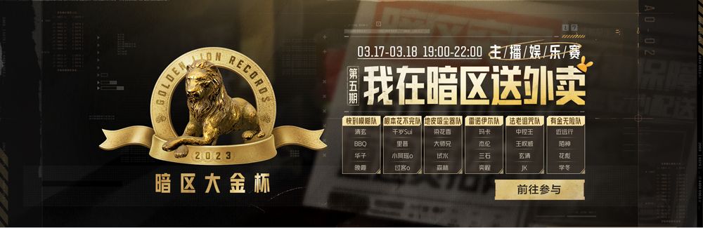 不同于以往,此次参赛的人气主播将首次集体“换装”——身穿外卖定制服装,带上“外卖包”来暗区送外卖!“暗区大金杯”第五期活动,诚邀各平台超人气主播集结,24位技术主播将组成6支战队突围;赛事进行的2天时间中,6支主播战队每天将以投掷物局(“雷杀”)、冷兵器局(“跑刀”)、男团乱杀(“大乱斗”)、霰弹枪局(“跑喷”)、全装局(“全装玩法”)等五种方式,进行BO5赛制物资争夺战,每天带出物资最多的队伍可直接兑换现金奖励,继续挑战还有机会获取积分大奖!