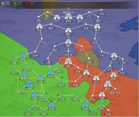 蜀国方面:天降神将【逍遥王】带领蜀国夺回【成都】,收复【陇西】【荆州】【武都】等,争霸阶段顶着高城防直攻【洛阳】。【小儿】【时梦容】西下攻【会稽】【九江】