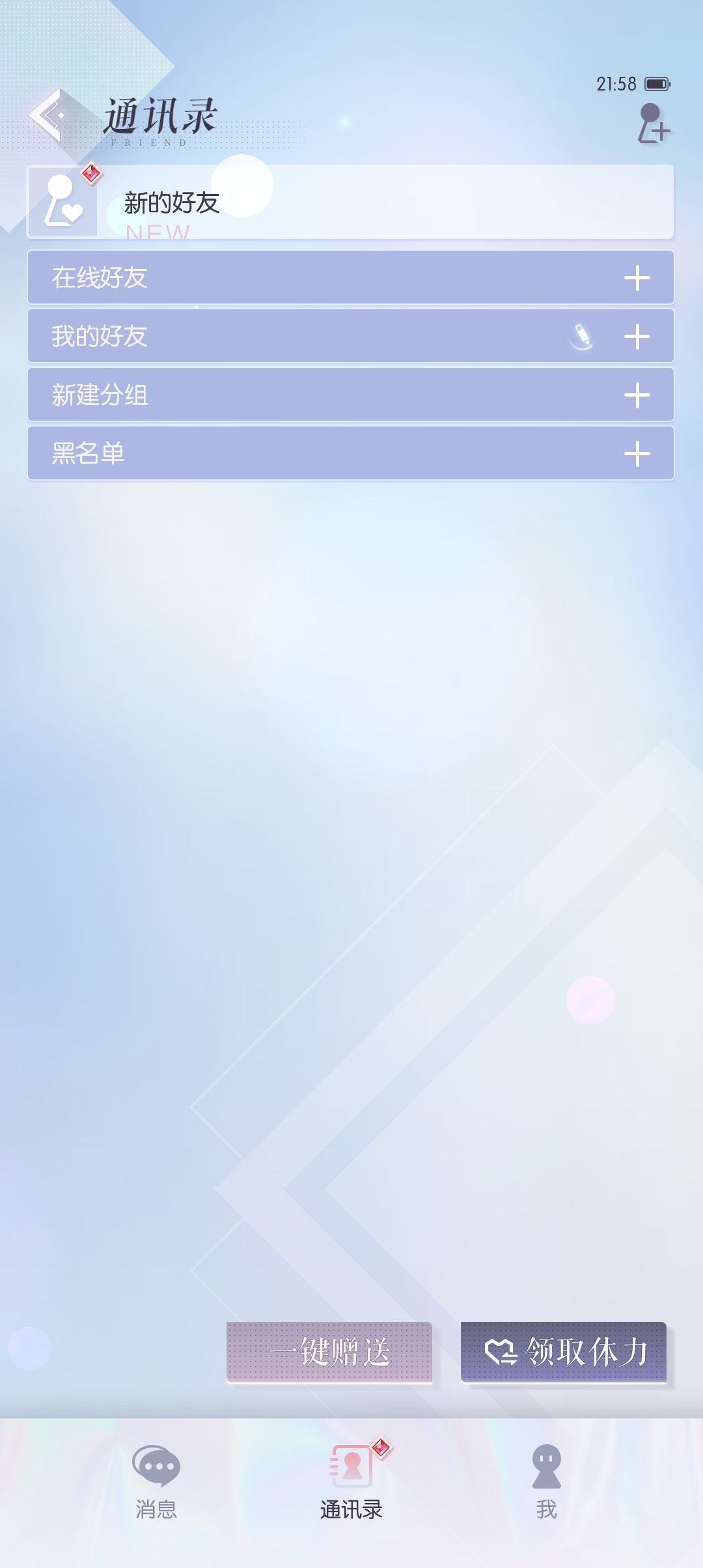 可以对好友进行分组,拉黑,举报等操作。有人加好友【新的好友】和【通讯录】会有红点提示。每天点【一键赠送】可以送所有好友体力,点【领取体力】可以领好友送的体力,每人3点,最多30点。