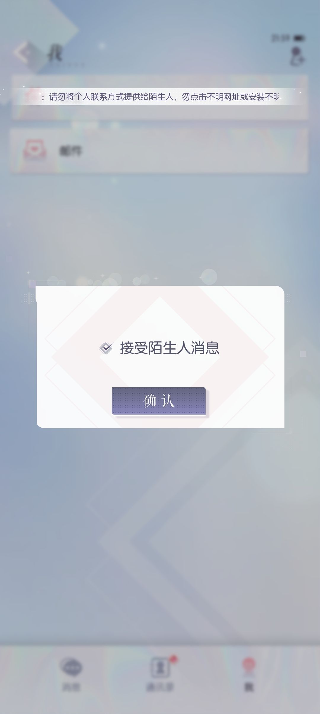 【小知识】如果关闭接收陌生人信息则陌生人无法与你建立临时会话。主界面领取完邮件邮箱图标消失,可以在这里手动打开。