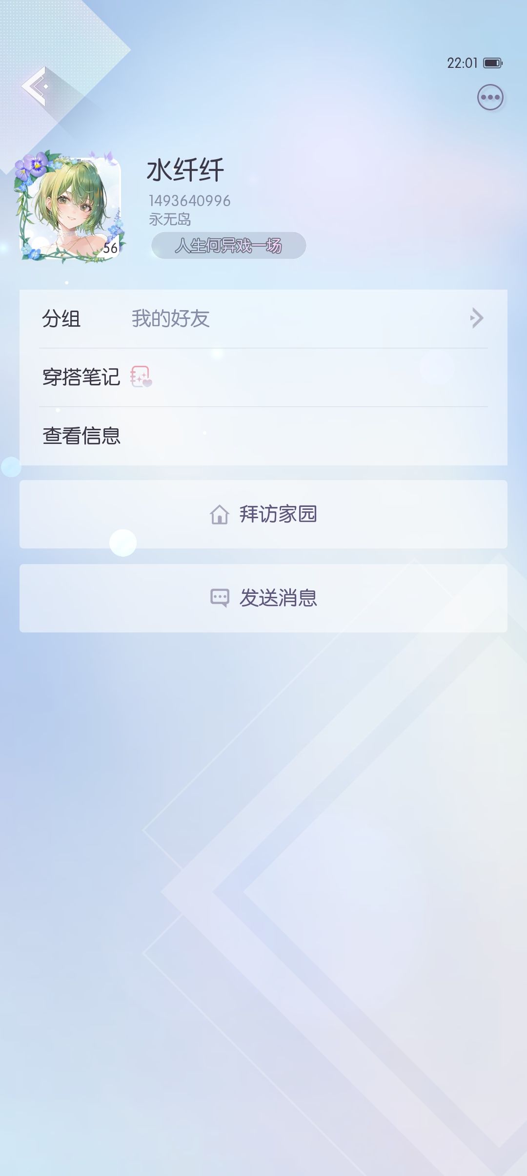 点击好友头像可以查看好友资料,可以看到好友的头像 头像框 昵称 协会 ID 称号等信息,可以手动对好友进行分组,默认在【我的好友】,可以查看好友的穿搭笔记(自拍)和当前穿的时装,还可以快捷拜访好友家园,非常方便。下面的发送消息按钮一般不用。点击右边的三个点,可以对好友进行 删除 拉黑 举报