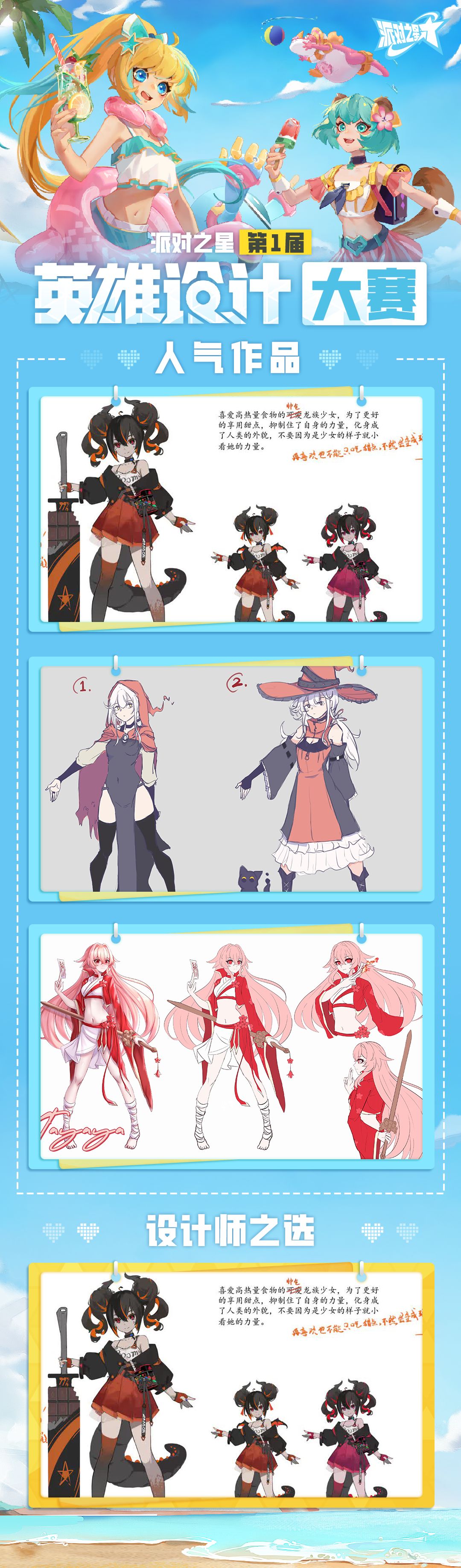 有关全新的共创英雄的设计进度,后续我们会在社区中持续分享,感谢每一位在大赛期间关注、投稿和提出建议的派对之星,英雄设计大赛还没有结束,所有未选中的参赛作品在下期活动中还可以继续投稿参与。
