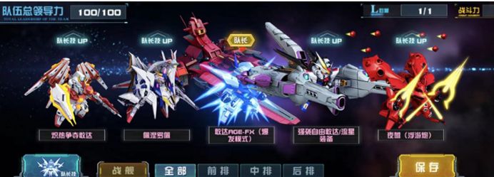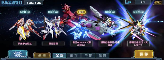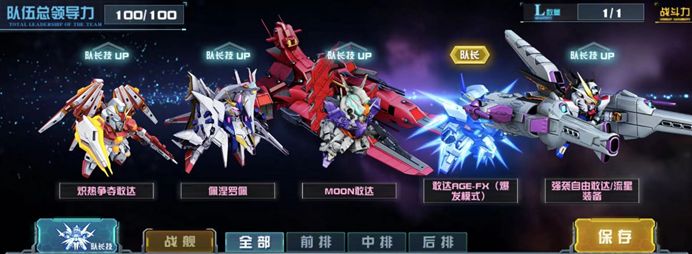 从敢达AGE-FX(爆发模式)机体标签出发,将敢达AGE-FX(爆发模式)作为队长技放入浮游系列机体队伍,尽管该支队伍缺少前排机体,但敢达AGE-FX(爆发模式)拥有回复能力,保证了队伍整体的硬度。