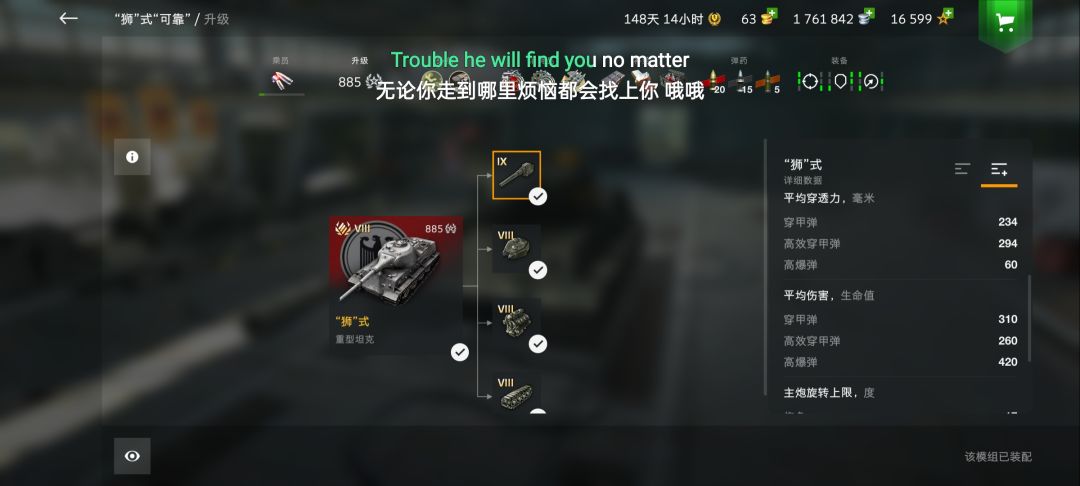 极限射速可以拉进11.79秒,单发高,穿深足,双缩5.5缩圈在重坦中也不算太慢了,其实炮控还可以,0.317(带散布插槽是0.285)的散布,还是可以的,有地形的时候卡坡上比狮子安逸点,毕竟狮子的脸颊可以被打穿的,这辆车的穿深甚至比狮子高。