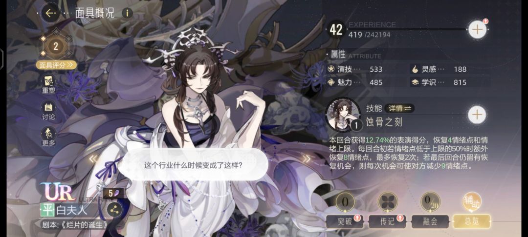 ⭕技能很简单,只有单纯的三回合全属性加成。可能乍一看三回合的全属性很强,但是奈何累加属性太低。满级技能每回合累加属性也就只有412点,三回合下来能直接影响得分的也就只有分散在三回合的412,824和1236点演技与学识,且增加的灵感和魅力如果不迸发,那相当于是无效的。况且这么一点全属性并不能带来什么特别明显的增益🙅。