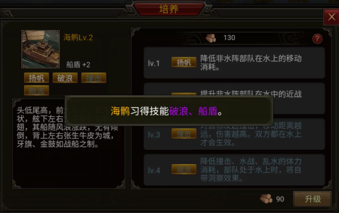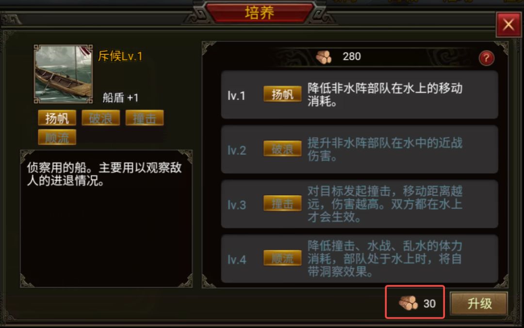 顺流:降低撞击、水战、乱水的体力消耗。部队处于水上时,将自带洞察效果。