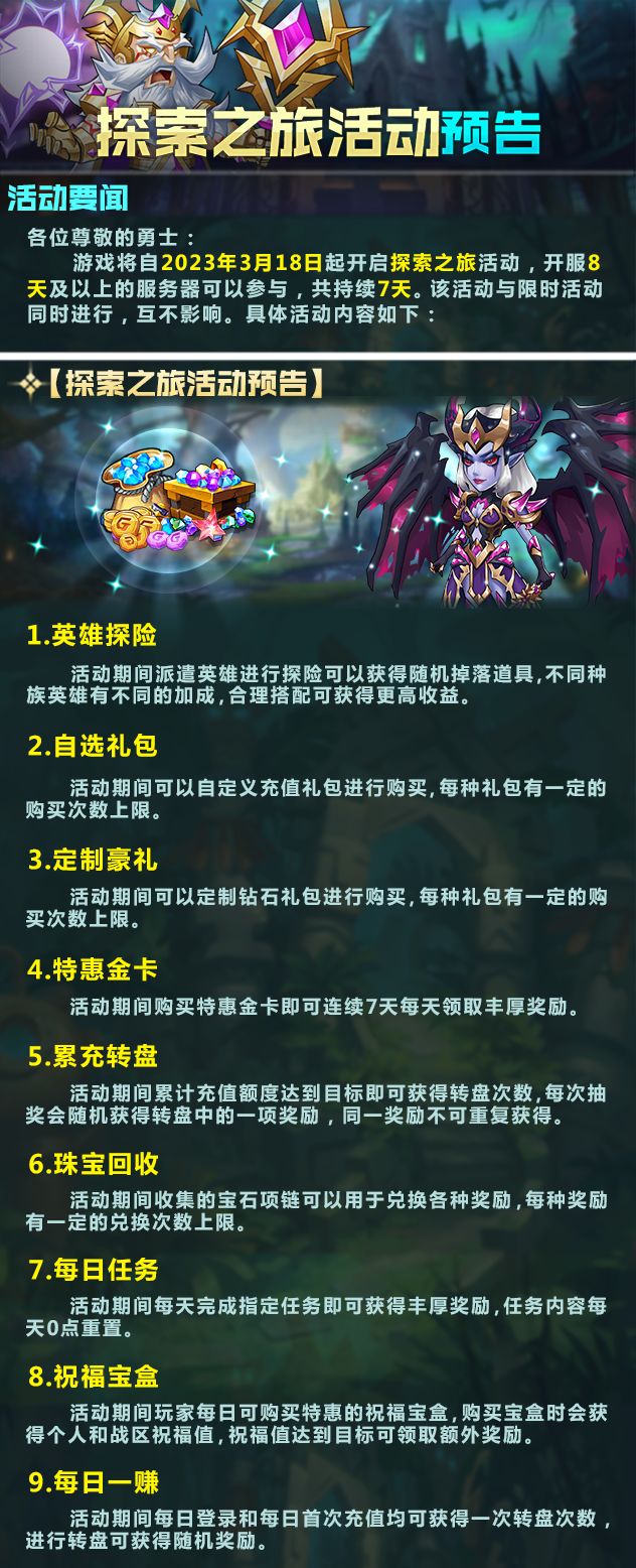 【探索之旅活动预告】游戏将自2023年3月18日起开启探索之旅活动,开服8天及以上的服务器可以参与,共持续7天。该活动与限时活动同时进行,互不影响。具体活动内容如下:
