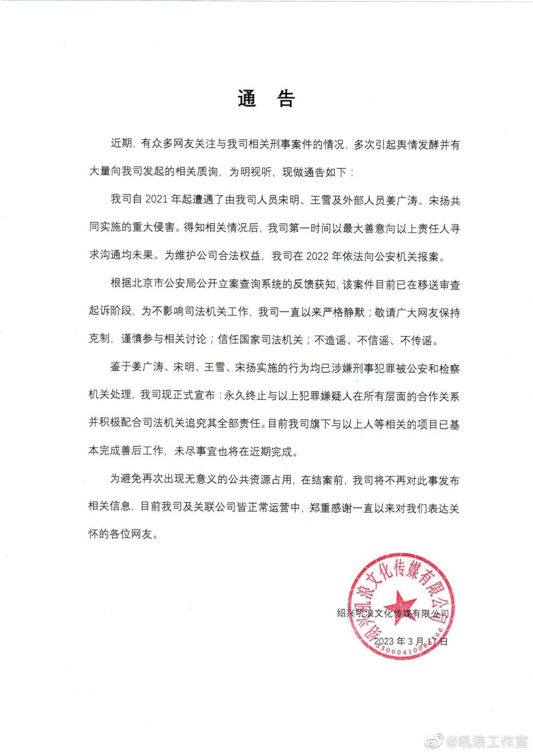 吼浪工作室今日发布了声明 :姜广涛、宋明、王雪、宋杨已涉嫌刑事犯罪被公安和检察机关处理。
